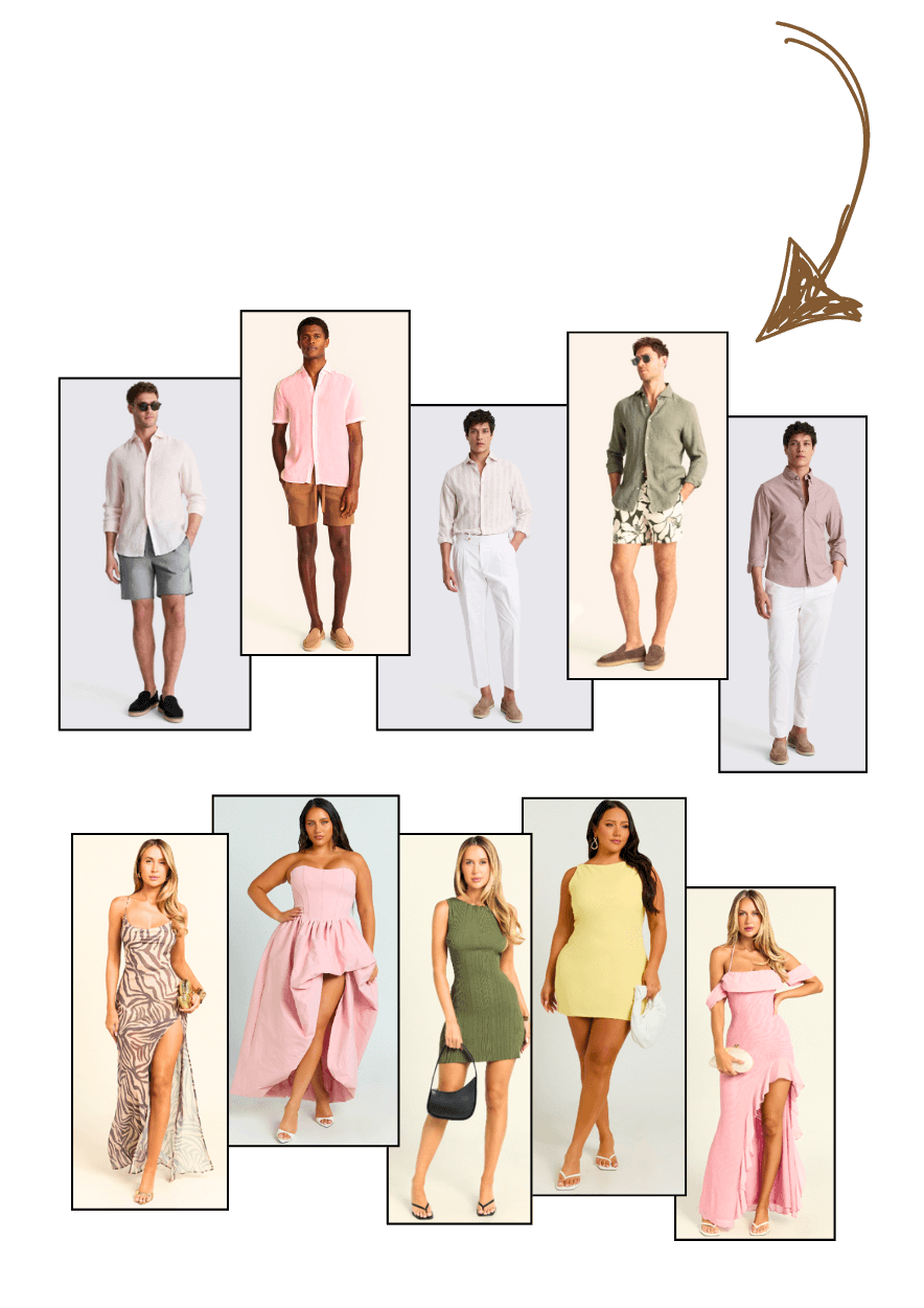 Light/breathable shoes instead of dress shoes (e.g. boat shoes or espadrilles (feel free to bring flip flops for later in the evening)