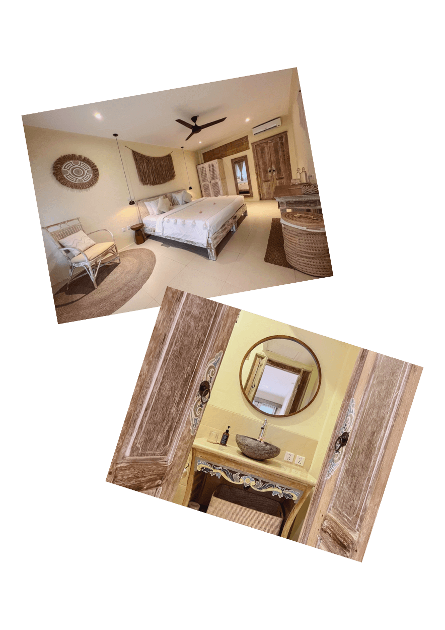 Each room is beautifully styled and has air-conditioning, ceiling fan, private ensuite bathroom (with basin, toilet, shower, towels, etc), and a balcony or terrace.